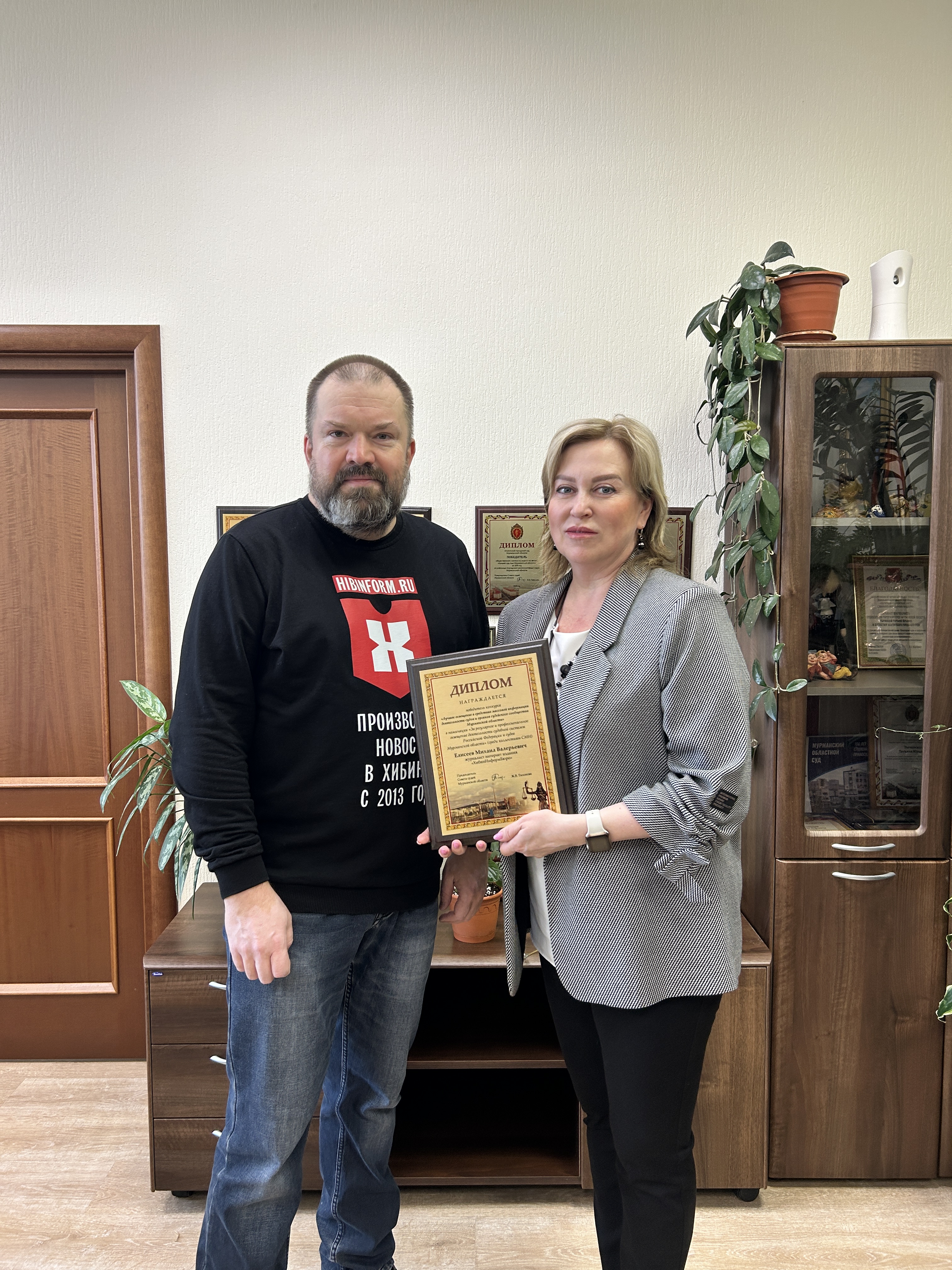 Советом судей Мурманской области были подведены итоги ежегодного конкурса среди печатных изданий, радио и телевизионных каналов. Победителем конкурса «Лучшее освещение в средствах массовой информации деятельности судов и органов судейского сообщества Мурманской области» в номинации «За регулярное и профессиональное освещение деятельности судебной системы Российской Федерации и судов Мурманской области» (среди коллективов СМИ) стал Елисеев Михаил Валерьевич (журналист интернет издания «ХибИнформБюро»). Диплом победителю вручила председатель Апатитского городского суда Тычинская Татьяна Юрьевна. |
